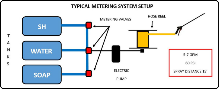 Electric pumps with a pressure switch are ideal for metering, as they can suck the amounts of each chemical needed and simply turn off when the trigger on the wand is released. Additionally, the electric pumps used for metering are quiet and can be used in residential neighborhoods that have noise restrictions during early morning and late evening hours.
