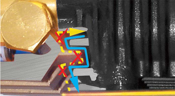 A labyrinth coupling system where the pump head meets the crankcase to allow water to escape, but prevents dust from entering the piston chamber.
